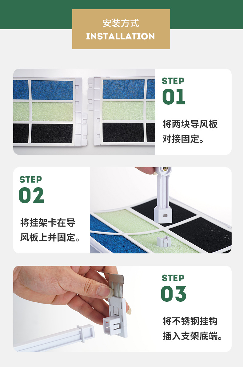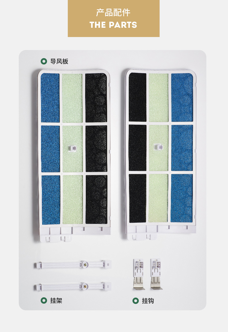 空调挡风板又叫做空调导风板,是一种利用导风板来引导风向流向的工具,家庭用空调挡风板就是一种家庭使用引导风向的工具,主要是针对家里有老人小孩使用。那么空调挡风板买了之后怎么安装呢一、空调导风板产品零部件:某品牌空调导风板的零部件主要有中导风板1个,两侧导风板2个,左右支架分别1个,左右挂板