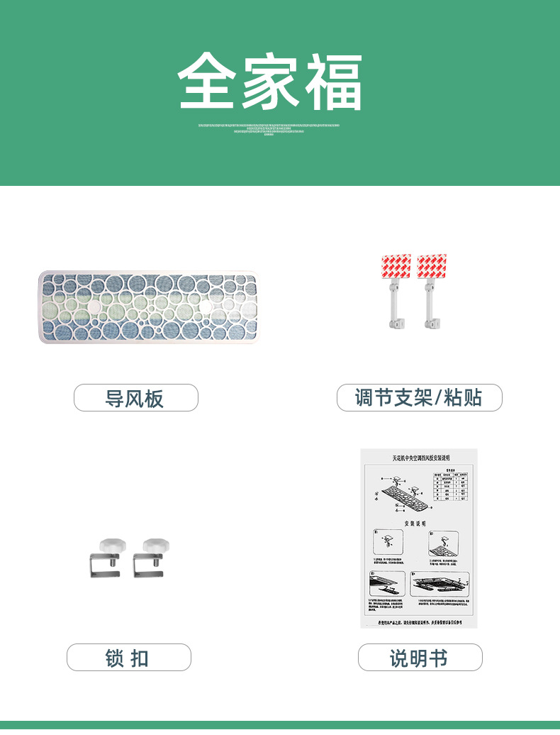 空调挡风板又叫做空调导风板,是一种利用导风板来引导风向流向的工具,家庭用空调挡风板就是一种家庭使用引导风向的工具,主要是针对家里有老人小孩使用。那么空调挡风板买了之后怎么安装呢一、空调导风板产品零部件:某品牌空调导风板的零部件主要有中导风板1个,两侧导风板2个,左右支架分别1个,左右挂板